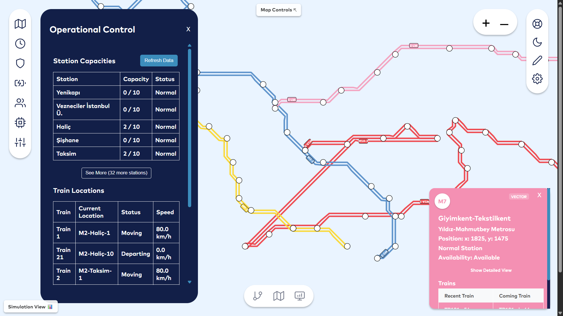 Metro operatörlerine yönelik gerçek zamanlı izleme, kaynak yönetimi ve güvenlik kontrolleri sağlayan web arayüzü. React ve Leaflet.js kullanılarak geliştirildi.